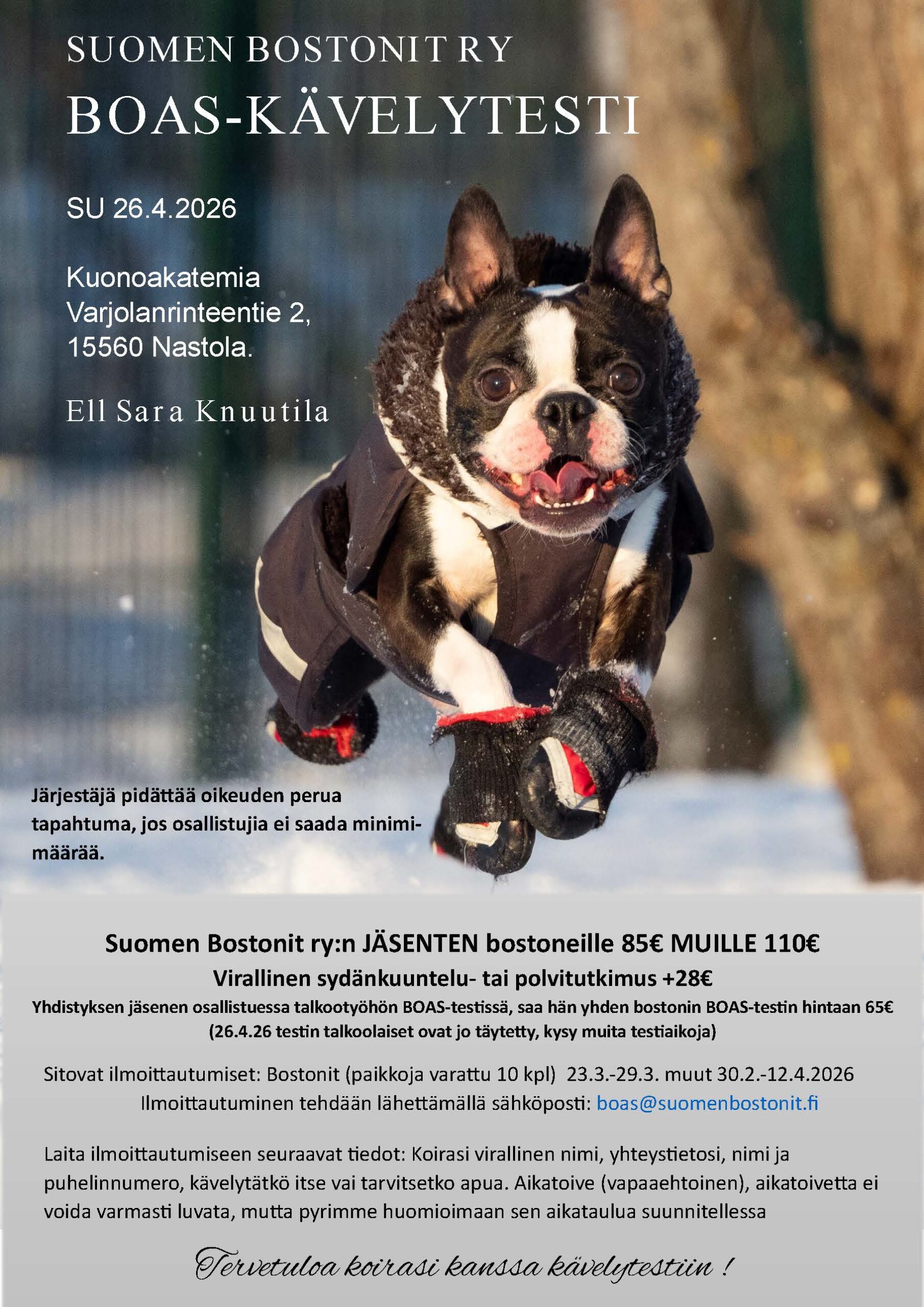 Tulevat tapahtumat, UutisetBOAS-kävelytesti su 26.4.2026 Nastola Posted on 24.2.2026 by Tarja Hyvärinen 24 helmi Erikoisnäyttely 20.6.2026 Killerin ravirata, Jyväskylä